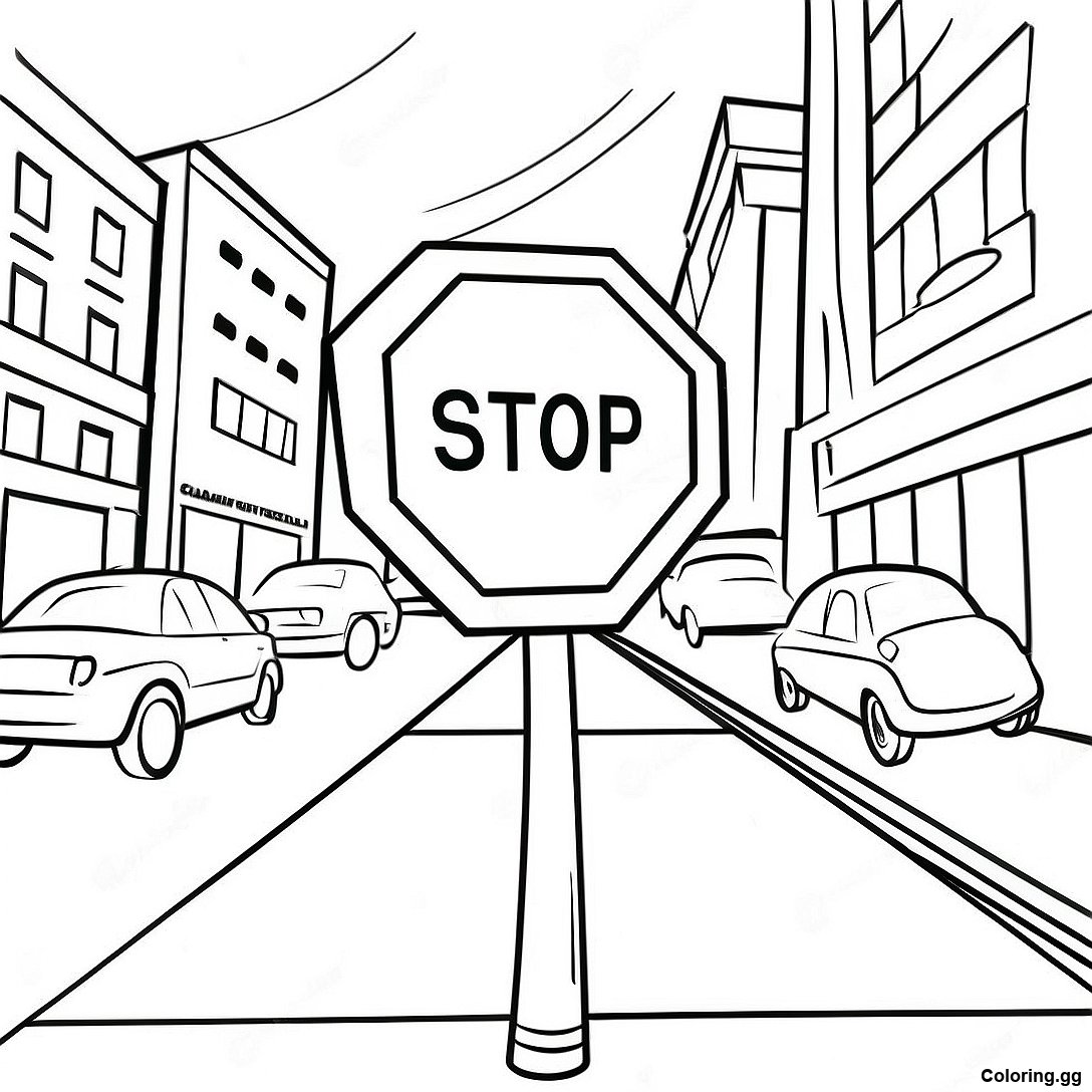 下载 卡通停止標誌在城市著色頁 的可打印 PDF