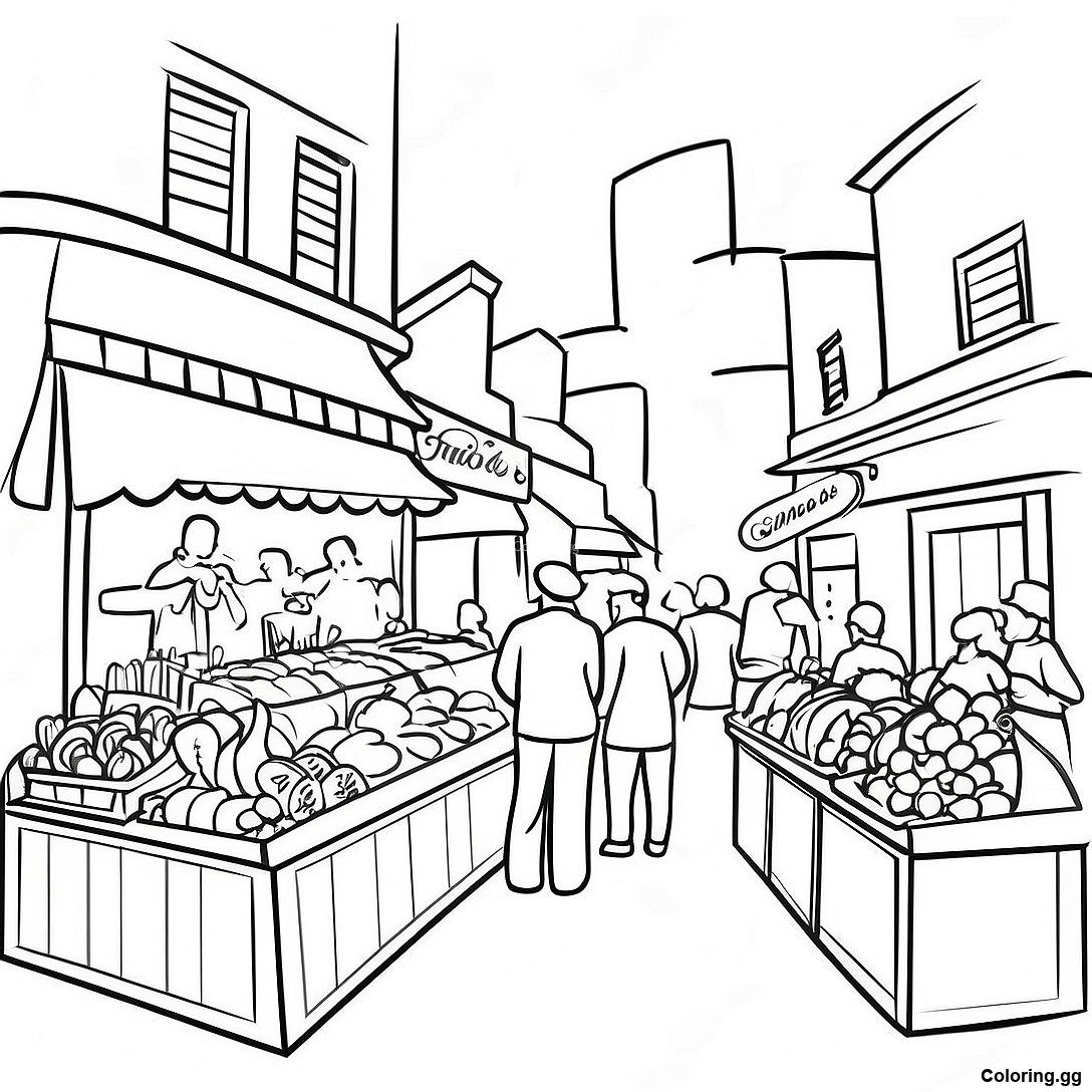 下载 色彩繽紛的法國市場場景著色頁 的可打印 PDF