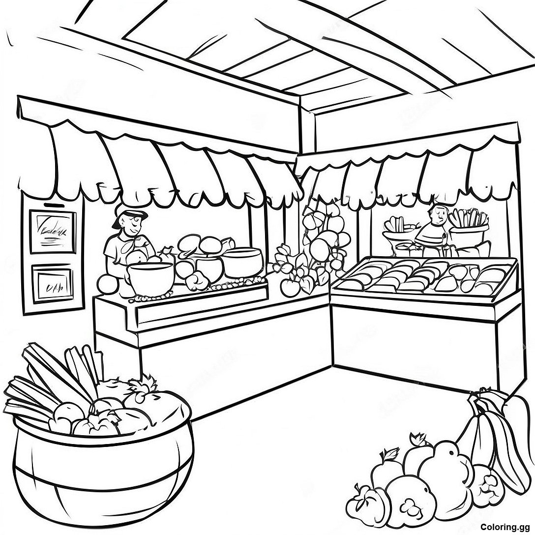 下载 色彩繽紛的法國市場場景著色頁 的可打印 PDF
