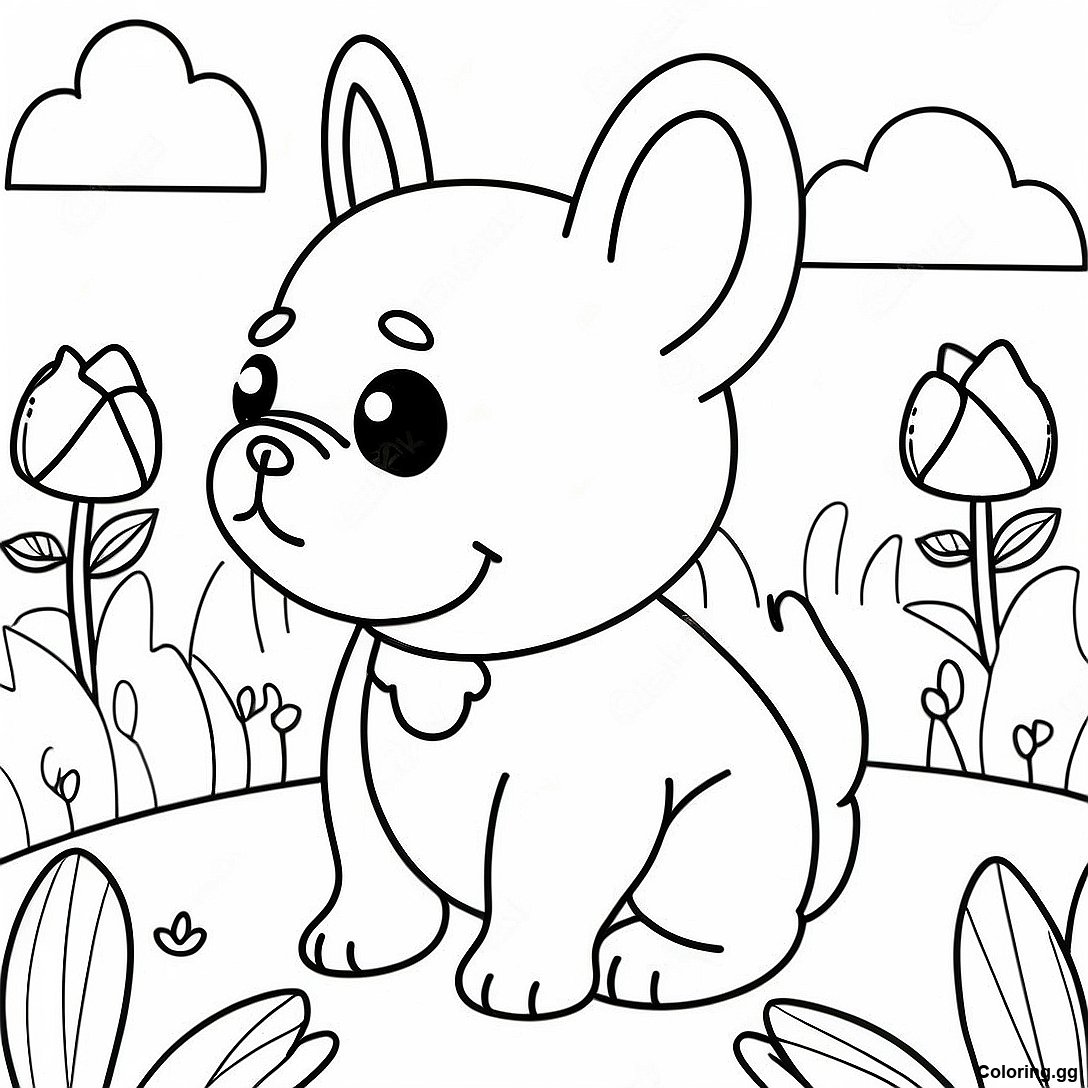下载 在花田裡可愛的法國鬥牛犬著色頁 的可打印 PDF